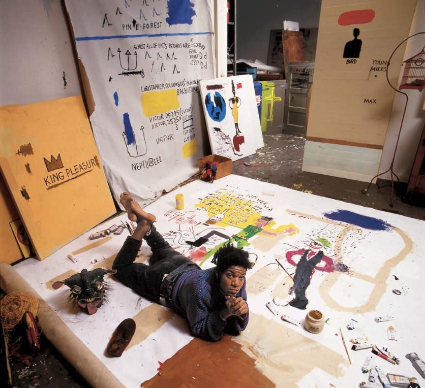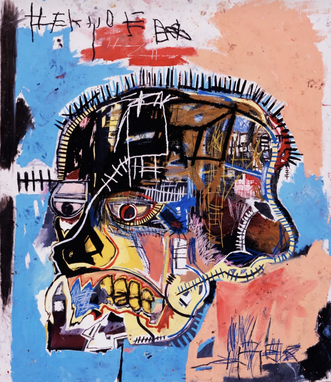 Basquiat 最初與好友 Al Diaz 以「SAMO」為名,在紐約下城留下帶有詩意與諷刺的塗鴉短句,並且迅速引起藝術圈關注。1980 年代初,他寫下「SAMO© IS DEAD」字樣,象徵告別街頭塗鴉,正式將塗鴉的能量帶上畫布。他的作品融合非洲與加勒比文化、醫學圖像、爵士樂與黑人歷史,既原始狂烈,又知識密集。