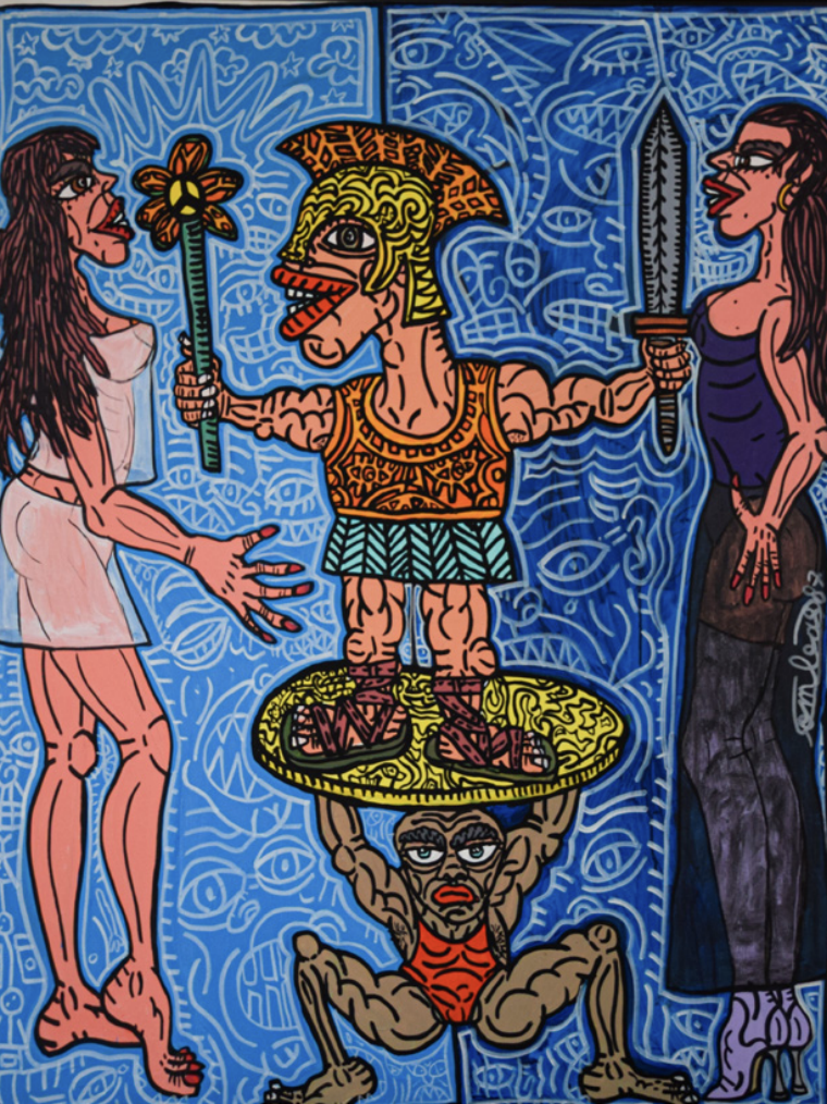 Combas 的作品充滿張力,他筆下的世界荒謬卻誠實:暴力與舞蹈、血腥與幽默、痛苦與節慶經常在同一畫面共存,像是一場毫不遮掩的人性實驗。他不透過控訴來傳達情緒,而是用視覺的衝撞讓觀者直面矛盾——當人類的荒謬性無所遁形,我們究竟要如何活下去?在 Combas 的語言裡,答案並不是逃避,也不是尋找秩序的庇護,而是:與混亂共舞。他以極端的能量將生命的跌宕推向畫布,彷彿在提醒我們,荒謬並非文明的缺陷,而是存在本身的一部分;只有承認它、擁抱它,我們才能在破碎之中找到前行的韌性。