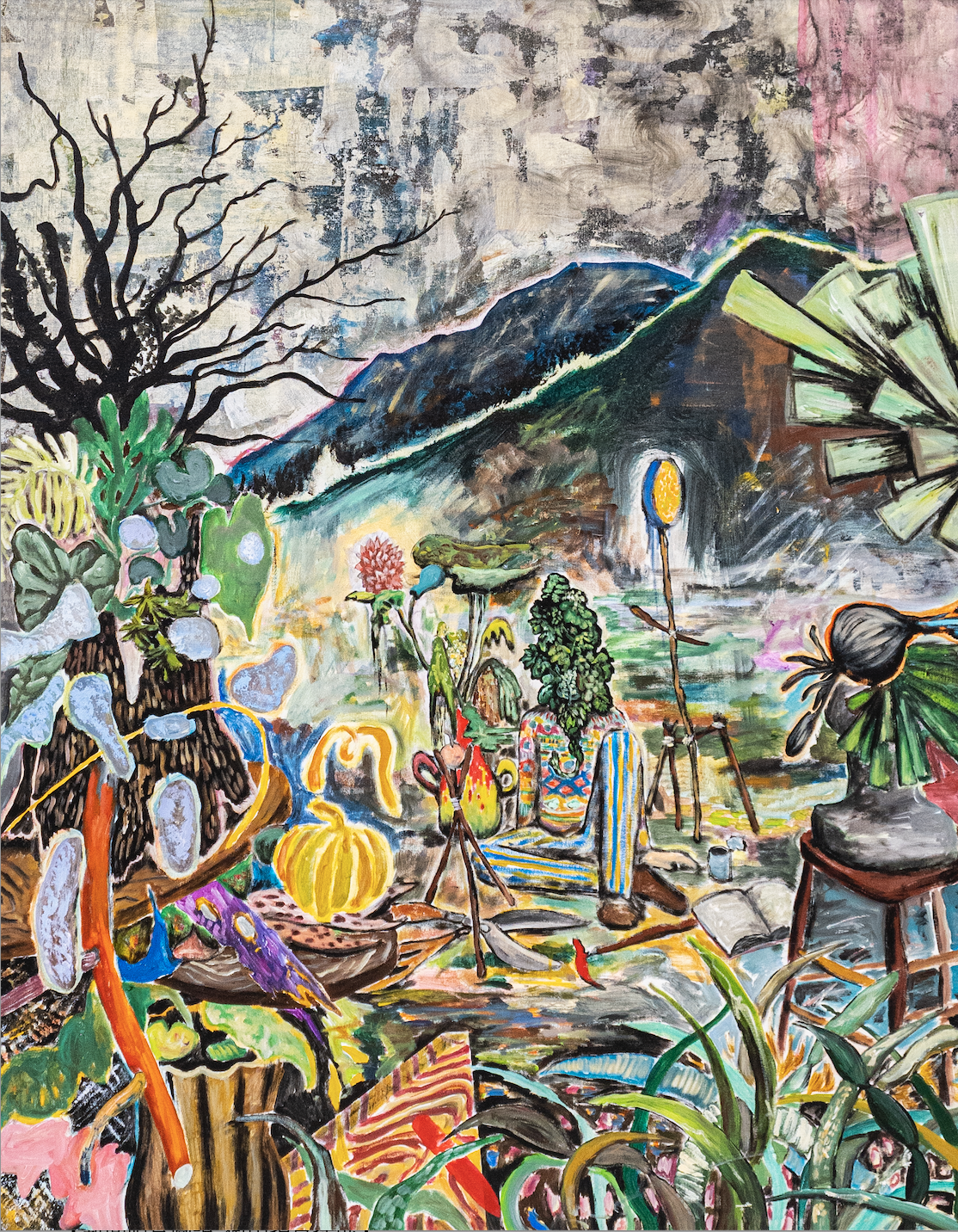 平子雄一「植物系列」創作靈感源於他留學英國時的經驗,他觀察到倫敦盛行的人造庭園文化——從公園、博物館到住家陽台,隨處可見人工精心修整的綠地植栽,相較之下,成長於日本岡山縣的他,自幼被群山與林木環繞。截然不同的環境使他在創作中融合兩種經驗,透過繪畫探索人與自然之間那條介於真實與人工的邊界。