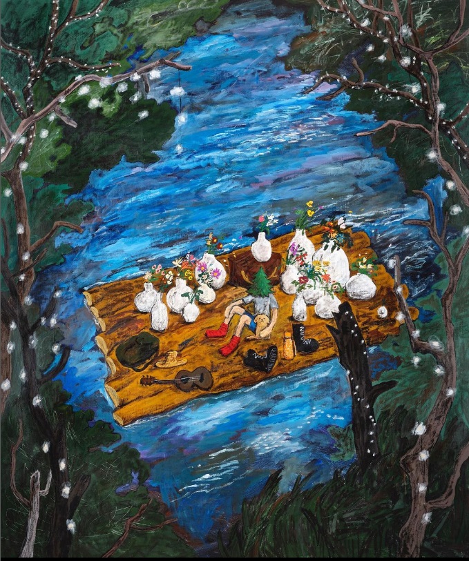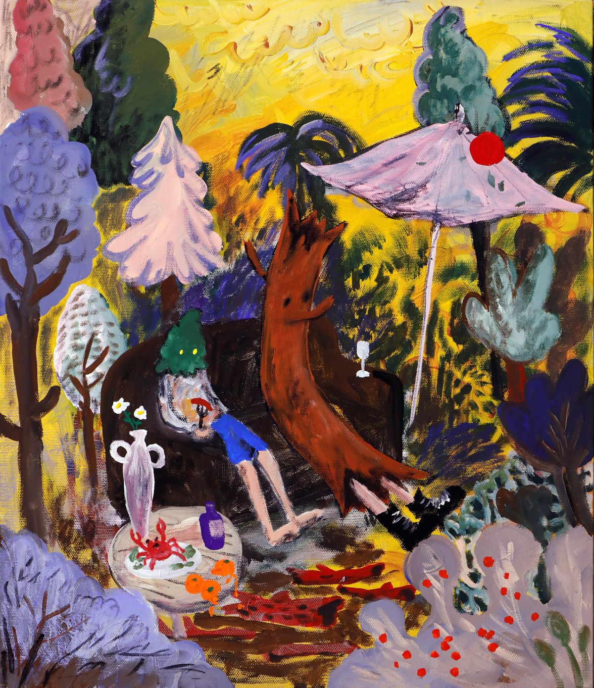 小樹人頭頂長著茂密的樹叢,身上穿著各式鮮豔服飾,帶著都市的節奏與個性,半人半樹的形象,模糊了人與自然的界線,也成為彼此對話的媒介。小樹人生活在森林與城市之間——他們可能站在汽車旁、坐在客廳裡,也可能消失在樹影深處,那種「既屬於自然、又融入日常」的狀態,正是平子筆下最迷人的矛盾。